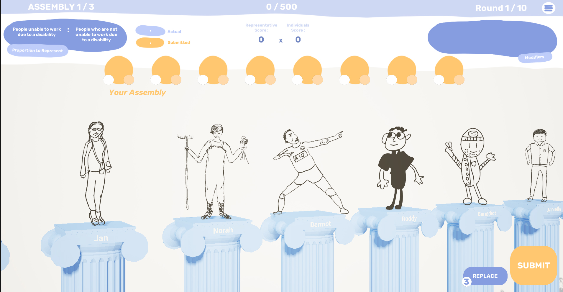 Citizen Assembler is a roguelike deckbuilder in which you are challenged with creating a citizens assembly, from a deck of 99 people, which is representative of the Irish population using Census Data from 2022.